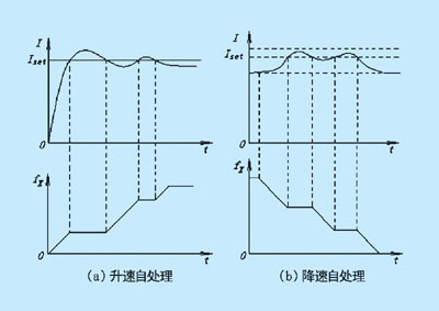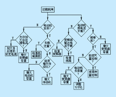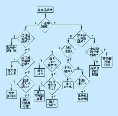 但多數變頻器的降速自處理功能隻考慮直流電壓,而無降速電流過大的自處理功能,需要注意閱讀說明書。 (3)其他措施 如果采用了自處理功能後,因延長了升、降速時間而不能滿足生產機械的要求,則: a) 考慮適當加大傳動比,以減小拖動係統的飛輪力矩,使電動機容易啟動及升速; b) 如果不能加大傳動比,則隻能考慮加大變頻器的容量了。 綜上所述,過電流跳閘的判斷流程如圖5所示。