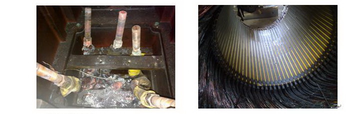 本文分析一台VLT6500變頻器運行中顯示過電流故障分析。 上海津信變頻器技術服務中心接到客戶緊急維修電話,客戶反映是現場一台VLT6500運行中過電流故障,並且電機內部有異味。 檢查過程: ranhougenjukehudefanyingqingkuang,womenlijikaishijianzhagaibianpinqi。xianjianzhabianpinqidemokuai,ceshierjiguantexinglianghao。jiangkongzhikachaixiahoukeyibadianyuankaquxia,yicichaixiabianpinqidequdongka,dianrongxiang,heIGBT模塊,整理模塊。對以上器件進行測試,性能良好。全部安裝好,靜態測試良好,變頻器送電,開機輸出電壓平衡。 電機檢查:將電機的接線盒打開後發現,電機的接線柱子已近完全燒壞。後將電機全部拆開發現內部繞組完全燒毀。見下圖: