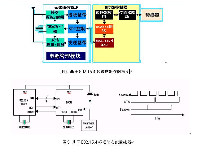 802.15.4wuxiantongxinmokuaifuzeshujudewuxianshoufa,zhuyaobaokuoshepinhejidailiangbufen,qianzhetigongshujutongxindekongzhongjiekou,houzhezhuyaotigonglianludewulixindaoheshujufenzu。weikongzhiqifuzelianluguanliyukongzhi,zhixingjidaitongxinxieyihexiangguandechuliguocheng,baokuojianlilianjie、頻率選擇、鏈路類型支持、媒體接入控製、功率模式和安全算法等。經過調理的傳感器模擬信號,由802.15.4無線通信模塊通過無線信道發送到主控節點,再進行特征提取、信息融合等高層決策處理。圖3是典型的基於802.15.4的傳感器係統邏輯框圖。圖5是一個基於802.15.4標準的心跳監視器。采用802.15.4/ZigBee 模式,網絡環境采用保證時間空檔,網絡信標每960ms or 61.44s發生一次;傳感器正在進行兩個處理:心跳次數記錄和傳送心跳速率和其它信息 (一共8個字節):瞬間和平均心跳、體溫和電池電壓。