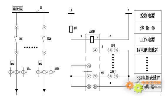 以計量32個電氣幹線電能為例,電能表為DTM862-2型,一次方案見圖8(a),電能脈衝采集二次見圖8(b)。使用傳統的機械式電能表附帶脈衝接口,利用智能化的脈衝接收裝置實現遠程集中式抄表功能。