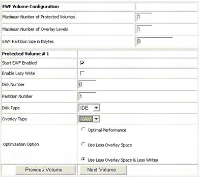 在“EWF Volume Configuration”中,選擇受保護的卷的數量。將覆蓋級別的數量設置為1。而且,選中 Start EWF Enabled複選框。如此即可。
