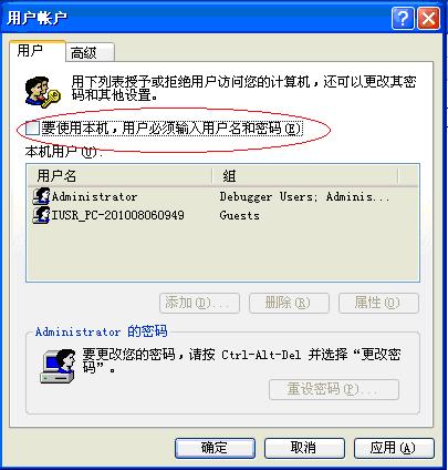 在彈出的“用戶賬戶”對話框中將“要使用本機,用戶必需輸入用戶名和密碼”選項去除。如圖4