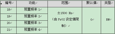 18號參數為預製頻率1,PLC可以通過更改PR18的值來修改變頻器頻率。PR18對應寄存器地址(協議級)=18-1=17,PLC通過通訊修改協議地址17的值改變變頻器頻率。
