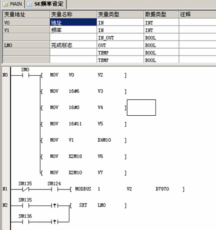 SK係列變頻器頻率通過MODBUS總線的通訊方式給定,PLC利用輸出端子控製SK係列變頻器的啟動和停止。