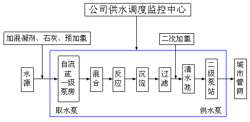 首先要選好合適的水源和取水口,用管道輸送至一級泵房(取水泵房)並在一級泵房前加氯以殺滅藻類、植物和貝類動物。再通過一級泵房將水送至廠內處理係統中。通常經過混合(在水源水中加入適量的氯化鋁,俗稱礬)、反應、沉澱、過濾、消毒等處理工藝,每一工藝配以相應的構築物(如沉澱池、濾池、清水池等),濾後消毒一般是加氯和氨,投加了消毒劑的水經清水池、並在池內停留一小時左右就成為合格的飲用水,再經過二級泵房(供水泵房)加壓輸送到城市管網中,供生活飲用和生產使用。