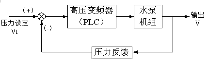 由(you)於(yu)吉(ji)林(lin)市(shi)自(zi)來(lai)水(shui)公(gong)司(si)第(di)三(san)水(shui)廠(chang)是(shi)新(xin)擴(kuo)建(jian)工(gong)程(cheng),用(yong)水(shui)負(fu)荷(he)需(xu)要(yao)在(zai)實(shi)際(ji)運(yun)行(xing)時(shi)進(jin)行(xing)精(jing)確(que)調(tiao)整(zheng)和(he)測(ce)量(liang),因(yin)此(ci)我(wo)廠(chang)采(cai)用(yong)的(de)是(shi)恒(heng)壓(ya)供(gong)水(shui)係(xi)統(tong),其(qi)工(gong)作(zuo)原(yuan)理(li)如(ru)圖(tu)3所示,測量元件為德國E+H公司的壓力傳感器,將它設在水泵機組出水口,Vi為恒定供水壓力設定值,供水壓力V作為輸出量,構成閉環控製係統。變頻器內部的PLC采集供水壓力值V與用戶給定值Vi進行比較和運算,通過PID進行調整,將結果轉換為頻率調節信號送至變頻器,直至達到供水壓力的給定值Vi。不管係統供水流量如何變化,供水壓力值V始終維持在給定壓力值Vi附近。