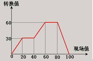 下麵通過一個簡單的例子來說明一下分段線性化的使用方法。假設我們需要的轉換值和現場值之間有下圖紅線所示的函數關係: