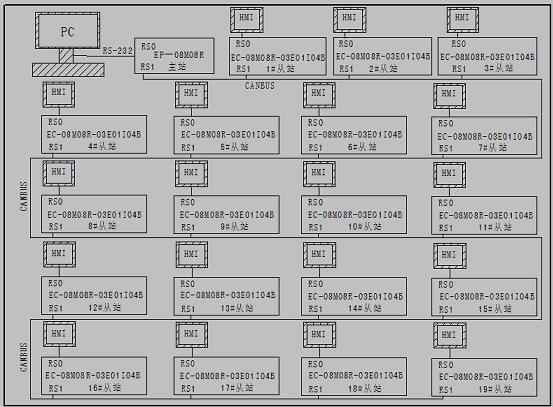 該鋰電池生產廠家一共有除濕機30台,有房間50間。每一台除濕機需要一台除濕機PLC,該係統一共用科威PLC 51台,51台PLC分布在樓上樓下二層,51台PLC組成一個CANBUS網絡,CAN主站將數據送到中控室計算機中。現場用觸摸屏控製,中控室用計算機控製並記錄相關信息。