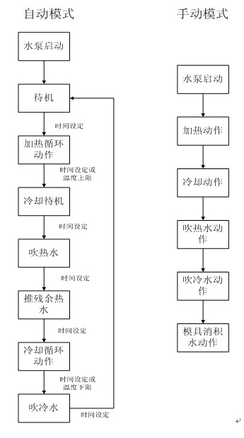 設備介紹: 該模溫機是協助一OEM客戶開發的,用於配合注塑機運行。最開始OEM客戶采用傳統的電器設備控製方式做了一台樣機,根據係統要求,控製水泵、水(shui)閥(fa)及(ji)一(yi)些(xie)報(bao)警(jing)顯(xian)示(shi)需(xu)要(yao)相(xiang)應(ying)的(de)一(yi)係(xi)列(lie)開(kai)關(guan)和(he)指(zhi)示(shi)燈(deng),還(hai)需(xu)大(da)量(liang)各(ge)種(zhong)繼(ji)電(dian)器(qi),接(jie)線(xian)也(ye)非(fei)常(chang)麻(ma)煩(fan)。樣(yang)機(ji)的(de)調(tiao)試(shi)及(ji)試(shi)用(yong)結(jie)果(guo)並(bing)不(bu)理(li)想(xiang),於(yu)是(shi)決(jue)定(ding)采(cai)用(yong)PLC來實現設備的運行控製。很明顯,在能達到係統控製要求的情況下,客戶優先選擇了價格便宜的西門子224CPU加上UniMAT的4TC模塊和16DO模塊來實現控製。 控製要求: 1.根據路溫度反饋或設定的時間控製熱水或冷水的排送。 2.控製流程分為手動控製和自動控製兩種方式,兩種控製方式不能同時進行,所有動作必須在水泵啟動的情況下完成。 3.通過觸摸屏監視和控製設備的運行情況,有報警顯示。 4.要求能保存幾組設定好的各時間、溫度參數,並能讀取直接用。  地址分配表: