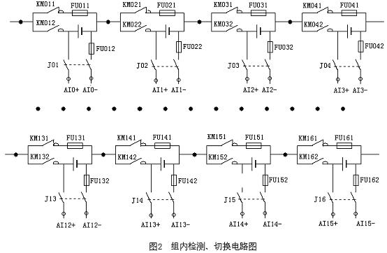 圖2 說明: 充電控製(如KM012)與旁路控製 (如KM011)分別為一個接觸器的常開點和一個常閉點。為防電池短路放電而設的熔斷器,選為60A。 J01,J02,。。。,J16是16選1繼電器組。在任何時刻,最多隻有一個繼電器吸合。為保證確切可靠運行,其繼電器多餘觸點可以接入PLC輸入,作為繼電器狀態檢測。在檢測和軟件互鎖均失敗的情況下,FU012強製熔斷,FU012為自恢複保險,或用R=20K電阻取代。