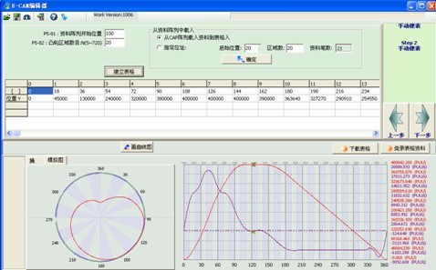 如(ru)果(guo)我(wo)們(men)在(zai)上(shang)述(shu)機(ji)構(gou)中(zhong)主(zhu)動(dong)軸(zhou)電(dian)機(ji)上(shang)安(an)裝(zhuang)一(yi)個(ge)編(bian)碼(ma)器(qi),從(cong)動(dong)軸(zhou)也(ye)增(zeng)加(jia)安(an)裝(zhuang)一(yi)個(ge)光(guang)柵(zha)尺(chi),然(ran)後(hou)再(zai)次(ci)運(yun)行(xing)這(zhe)個(ge)機(ji)械(xie)凸(tu)輪(lun),並(bing)將(jiang)剛(gang)才(cai)主(zhu)動(dong)軸(zhou)轉(zhuan)動(dong)角(jiao)度(du)和(he)從(cong)動(dong)軸(zhou)上(shang)下(xia)位(wei)置(zhi)一(yi)一(yi)記(ji)錄(lu),並(bing)彙(hui)成(cheng)一(yi)條(tiao)數(shu)據(ju)表(biao)格(ge),那(na)麼(me)就(jiu)可(ke)以(yi)利(li)用(yong)軟(ruan)件(jian)的(de)方(fang)式(shi)來(lai)勾(gou)勒(le)出(chu)一(yi)條(tiao)曲(qu)線(xian)。這(zhe)條(tiao)用(yong)來(lai)描(miao)述(shu)主(zhu)動(dong)軸(zhou)、從動軸位置關係的軟件曲線就是電子凸輪曲線。
