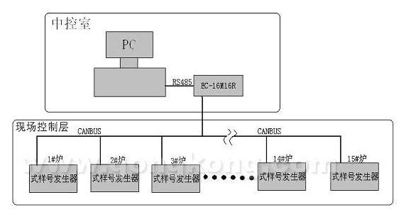 武漢鋼鐵公司為了增加鋼鐵產量,提高工作效率,2006年底對轉爐遠程數據傳送設備進行了改造。 係統介紹: 轉爐遠程數據傳送係統要把分布在各個車間的轉爐信號集中起來送給中控室。武鋼共有15個轉爐,分布距離總長為4200米(mi)。要(yao)求(qiu)把(ba)各(ge)個(ge)轉(zhuan)爐(lu)當(dang)前(qian)煉(lian)鐵(tie)的(de)工(gong)藝(yi)發(fa)送(song)到(dao)中(zhong)控(kong)室(shi),中(zhong)控(kong)室(shi)根(gen)據(ju)每(mei)個(ge)轉(zhuan)爐(lu)發(fa)來(lai)的(de)數(shu)據(ju)對(dui)各(ge)個(ge)轉(zhuan)爐(lu)的(de)煉(lian)鋼(gang)成(cheng)分(fen)進(jin)行(xing)分(fen)析(xi),同(tong)時(shi)根(gen)據(ju)需(xu)要(yao)還(hai)向(xiang)各(ge)個(ge)轉(zhuan)爐(lu)發(fa)送(song)下(xia)批(pi)需(xu)要(yao)煉(lian)鐵(tie)的(de)工(gong)藝(yi),操(cao)作(zuo)工(gong)根(gen)據(ju)傳(chuan)輸(shu)過(guo)來(lai)的(de)數(shu)據(ju)進(jin)行(xing)工(gong)作(zuo)。因(yin)而(er)中(zhong)控(kong)室(shi)與(yu)各(ge)轉(zhuan)爐(lu)之(zhi)間(jian)的(de)數(shu)據(ju)交(jiao)換(huan)尤(you)為(wei)重(zhong)要(yao),整(zheng)個(ge)網(wang)絡(luo)要(yao)求(qiu)高(gao)可(ke)靠(kao)性(xing)和(he)實(shi)時(shi)性(xing)。 武鋼轉爐原采用RS485通訊,但存在很多弊病,例如通訊距離很有限,通訊速率較低,信號不穩定等。 科威嵌入式PLC芯片組帶有CANBUS通(tong)訊(xun)功(gong)能(neng),基(ji)於(yu)該(gai)芯(xin)片(pian)組(zu),根(gen)據(ju)武(wu)鋼(gang)轉(zhuan)爐(lu)改(gai)造(zao)需(xu)求(qiu),外(wai)圍(wei)加(jia)上(shang)相(xiang)應(ying)的(de)數(shu)碼(ma)顯(xian)示(shi)單(dan)元(yuan)和(he)指(zhi)令(ling)控(kong)製(zhi)按(an)鍵(jian),就(jiu)開(kai)發(fa)出(chu)了(le)式(shi)樣(yang)號(hao)發(fa)生(sheng)器(qi)。該(gai)產(chan)品(pin)通(tong)訊(xun)速(su)率(lv)5―500K可以自由設定,通訊距離最遠可達10公裏,可靠性高,且具有可編程性,靈活性好,取代原有的通訊設備後,徹底解決了原有問題。 轉爐遠程數據傳送係統結構如圖1所示,該係統包括一台PC機,一台科威帶CAN通訊的32點的PLC,以及放置於現場的15台式樣號發生器。