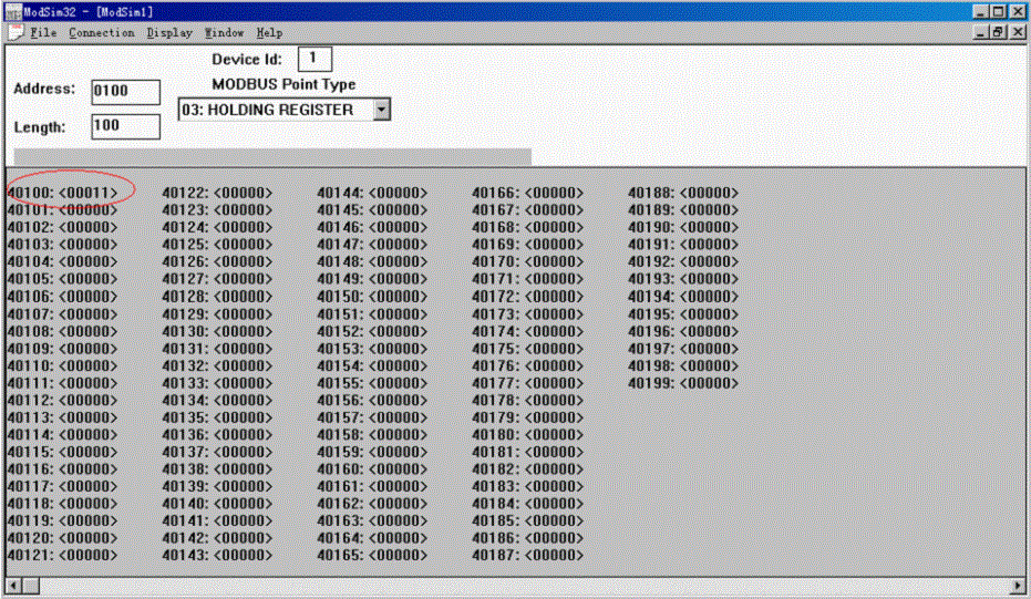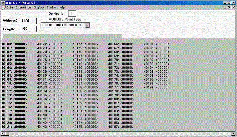 點擊“file”,然後點擊“new”新建一個窗口,Device Id:1對應的是組態軟件裏的設備地址1,03:HOLDING REGISTER對應的是保持寄存器。ADDRESS:0100是從地址100開始。如下圖所示;