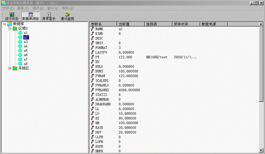 建立數據庫模擬I/O點,a1-a8,然後關聯外部連接,點名建立後雙擊後邊外部連接的空白處,彈出modbus組點對話框,選擇保持寄存器也就是modbus的功能碼03,偏置地址選擇99,對應的modbus協議的地址是100(紫金橋軟件的偏置地址加1對應的是modbus協議地址)如圖6所示;