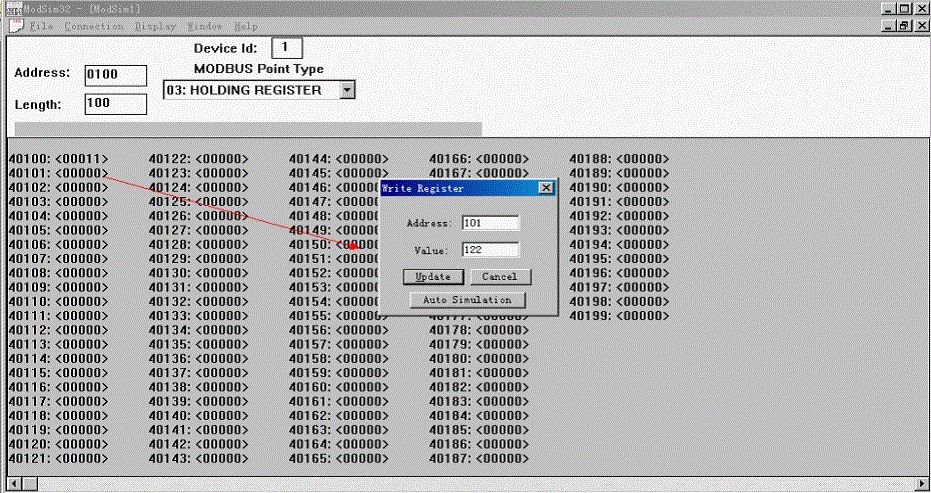 也可以通過MODBUS仿真軟件設置數據。雙擊101寄存器,彈出如下對話框,設置數據,點擊UPDATA。