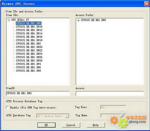 5、依次添加組和變量,“Add Group”,“Add Item”;瀏覽OPC server,“Browse Server”;將Server中的變量,對應到IFIX的變量。