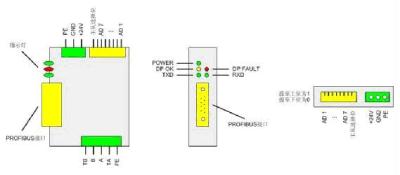 (1) 如圖 1-0,頂部為電源接口(直流 24V)、Modbus 主從設置撥碼(MS 為 Modbus 做從站, MM 為做 Modbus 主站)、Profibus 地址設置撥碼(采用的是 8421 碼,如 AD1-AD3 撥到 ON 的 位置地址為 7)。