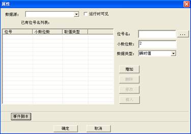 該組件通常運行時是隱藏的。可以在屬性設置對話框中增加所需查詢的曆史點(可以同時查詢多個)。通過點擊“事件腳本”,可以在此編寫所需的腳本語句,如圖所示: