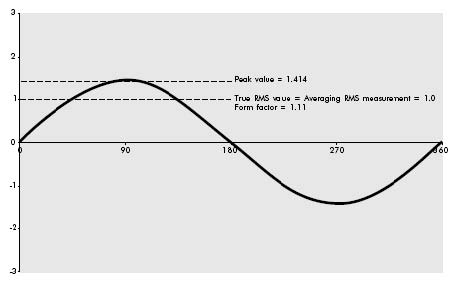 在測量一個純正弦波(僅限於純正弦波)時,簡單的測出平均值(0.636倍峰值),再乘以波形因數1.111(即0.707倍峰值)所得到的數值是完全正確的,這個數值也被稱為有效值。這種方法被廣泛用於所有的模擬測量儀(此時平均值是靠線圈運動的慣性和阻尼作用來實現的)和所有舊式、儀表和大多數電流表數字萬用表上。這種技術被稱為“平均讀數,按有效值校準”的測量方法。