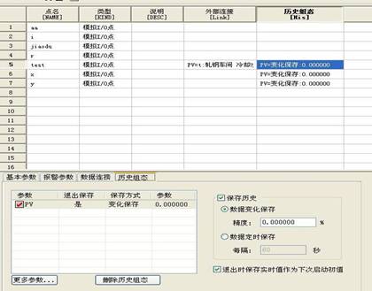 - 在數據庫中建點test,這個點也就是你要畫圓形曲線的數據來源,保存曆史趨勢(選變化保存曆史趨勢,保存精度選0,並且把“退出時保存實時值作為下次啟動初始值”選上)。