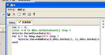 - 在畫麵DRAW1上建立取全部曆史組件his,在它的“時間腳本”的“數據刷新”裏麵有腳本,第3行腳本是畫圓前清除以前的曲線,第4、5、6行腳本就是把組件his裏的數據根據用戶選的天數畫到圖上,對象#circle是自由曲線對象。
