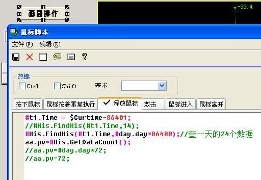 - 在畫圓操作按鈕裏有腳本,當釋放鼠標時,第1行腳本是把#t1.Time置成前一天的時間值(秒數),第3行腳本是讓曆史組件his取前一天的曆史數據。
