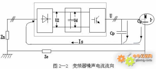 輸出電壓與電流的波形: 絕大多數變頻器的逆變橋都采用PWM調製方式(如圖2―2),其輸出電壓為占空比按正弦規律分布的係列矩形波(如圖2-3所示)。 寄生電容Cp存在於電機電纜和電機內部,因此變頻器的PWM輸出電壓波形的開關翼部通過寄生電容產生一個高頻脈衝電流Is,使變頻器成為一個諧波幹擾源。由於諧波電流Is的產生源是變頻器,因此它一定要流回變頻器。圖中Ze為 大地阻抗,Zn為動力電纜與地之間的阻抗。諧波電流流過此二阻抗所造成的電壓降,將影響到同一電網上的其它設備造成幹擾。