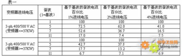 總是出現在電源電壓的振幅值附近,呈不連續的衝擊波形式(如圖2-1所示)。它具有很高的奇次諧波成份,特別是5次和7次諧波,如表一(以西門子MM3變頻器為例)。