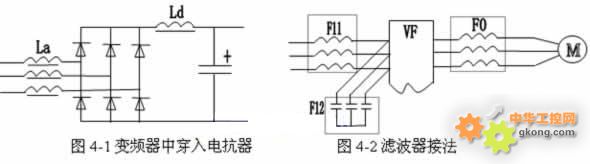 交流電抗器(進線電抗器):串聯在電源與變頻器輸入側之間(如圖4-1中La),進線電抗器的主要作用如下: (1) 降低變頻器產生的諧波,同時增加電源阻抗。 (2) 吸收削弱附近設備產生的浪湧電壓、電流和主電源的電壓尖峰對變頻器的衝擊。 (3) 消弱電源電壓不平衡對變頻器的影響 61548; 直流電抗器(平波電抗器):串聯在整流橋和濾波電容之間(如圖4-1中Ld),它的功能主要就是削弱逆變器輸入電流中的高次諧波成份,並且可通過抑製諧波電流來提高功率因數。 2)濾波器; zaibianpinqideshurushuchucedianluzhong,chushangshujiaodicidexiebochengfenwai,haiyouxuduopinlvjiaogaodexiebodianliu,tamenjiangyigezhongfangshixingchengduiqitashebeideganraoxinhao,lvboqijiushiyongyuxueruopinlvjiaogaodexiebofenliangdefangfa(如圖4-2所示)。 61548; 輸入濾波器:通常有兩種 (1) 線路濾波器:主要由電感線圈構成(如圖4-2中F11所示)。它主要通過增大線路在高頻下的阻抗來削弱頻率較高的諧波電流。 (2) 輻射濾波器:主要由高頻電容構成(如圖4-2中F12所示,也可以△接方式)。它將吸收掉頻率很高的具有輻射能量的諧波成份。使得流回電源的高頻電流大大減少。(也可以采用變頻器生產廠家提供的專用“無線電抗幹擾濾波器”)。 61548; 輸出濾波器:也主要由電感線圈構成(如圖4-2中F0所示)。它可以有效地削弱輸出電流中的高次諧波成份,不但起到抗幹擾作用,而且能削弱電機中高次諧波電流引起的附加轉矩。 注:當輸出濾波器由LC電路構成時,濾波器內接入電容器的一側,必須與電動機相接。