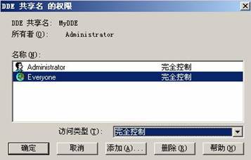 以上操作完成之後,點擊右下方的“權限”按鈕,打開“DDE共享名的權限”對話框。如下圖: