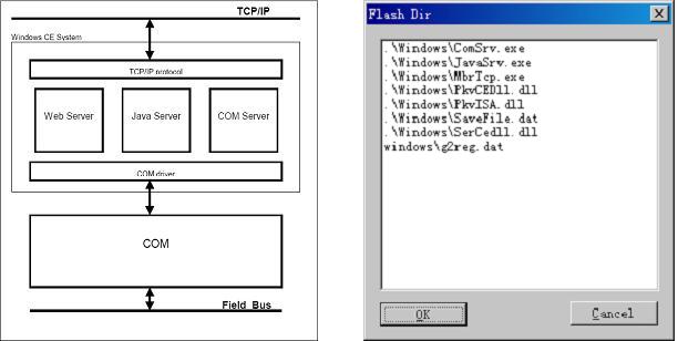 如上圖所示,COM通訊模塊實現Profibus主站功能,當使用SYCON配置軟件通過COMServer將從站配置信息下載到COM模塊後,COM即自主地與外部連接的DP從站實現通訊;同時,PKV內部FLASH集成的程序MbrTcp.exe實現了COM與外部ModbusTCP客戶機的數據交換,因此我們可以通過ModbusTCP客戶機來控製DP從站的IO;另外我們看到PKV內部集成了一個JavaSrv.exe,它是一個Java服務器,因此我們可以編寫集成JavaApplet的HTML網頁,然後傳送到PKV的FLASH中,然後我們就可以在遠程PC機上通過IE瀏覽器來讀寫PKV內部的DP從站數據。