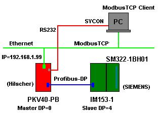 在本案例中,我們采用西門子公司使用最廣泛的DP從站ET200M係列中的IM153-1(訂貨號6ES7153-1AA03-0XB0)作為PKV連接的從站,上位計算機采用ModbusTCP客戶機軟件來實現通訊。整個配置如下圖: