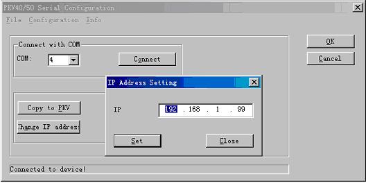 選擇Tools菜單->PKV40-PB->PKV40SerialConfiguration,在彈出的對話框中選擇相應的串口,然後點擊Connect按鈕連接到PKV,然後選擇Configuration菜單中的相關菜單設置PKV的IP地址和子網掩碼,如下圖所示: