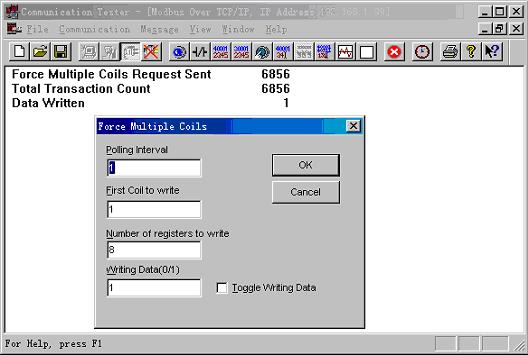 在計算機上運行ModbusTCP客戶機軟件Commtest.exe,設置ModbusTCP服務器IP為192.168.1.99,連接後用FC15寫輸出,如下圖所示: