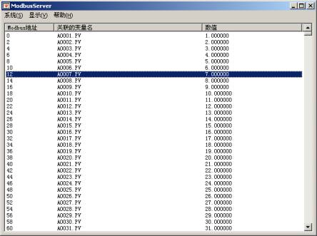 其中左側為變量配置顯示區,它分為三列,分別是序號、數據庫位號和Modbus地址。後兩列的意義是把某一個數據庫位號和一個Modbus地址建立映射關係。