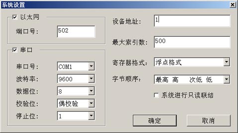 我(wo)們(men)可(ke)以(yi)看(kan)到(dao)共(gong)有(you)以(yi)太(tai)網(wang)和(he)串(chuan)口(kou)兩(liang)種(zhong)方(fang)式(shi)供(gong)選(xuan)擇(ze)使(shi)用(yong),你(ni)可(ke)以(yi)選(xuan)擇(ze)他(ta)們(men)中(zhong)的(de)一(yi)個(ge)或(huo)兩(liang)個(ge)。當(dang)選(xuan)中(zhong)以(yi)太(tai)網(wang)方(fang)式(shi)之(zhi)後(hou),必(bi)須(xu)輸(shu)入(ru)相(xiang)應(ying)的(de)端(duan)口(kou)號(hao),缺(que)省(sheng)情(qing)況(kuang)下(xia)是(shi)502端口,這是Modbus以太網協議規定的缺省端口號。當選中了串口方式後您需要選擇對應的串口並作和采集方相同的配置。