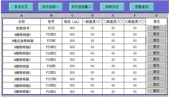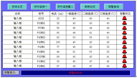 現場ARCM300-JI采(cai)集(ji)數(shu)據(ju)上(shang)傳(chuan)到(dao)本(ben)界(jie)麵(mian),客(ke)戶(hu)可(ke)根(gen)據(ju)需(xu)要(yao)對(dui)回(hui)路(lu)名(ming)稱(cheng)進(jin)行(xing)修(xiu)改(gai),方(fang)格(ge)內(nei)可(ke)以(yi)顯(xian)示(shi)相(xiang)應(ying)櫃(gui)子(zi)剩(sheng)餘(yu)電(dian)流(liu)實(shi)時(shi)值(zhi),三(san)路(lu)溫(wen)度(du)值(zhi),數(shu)據(ju)可(ke)周(zhou)期(qi)性(xing)更(geng)新(xin)。當(dang)剩(sheng)餘(yu)電(dian)流(liu)實(shi)測(ce)值(zhi)大(da)於(yu)報(bao)警(jing)設(she)置(zhi)時(shi),係(xi)統(tong)報(bao)警(jing)狀(zhuang)態(tai)指(zhi)示(shi)燈(deng)會(hui)自(zi)動(dong)閃(shan)爍(shuo)。界(jie)麵(mian)下(xia)端(duan)的(de)報(bao)警(jing)提(ti)示(shi)滾(gun)動(dong)條(tiao)會(hui)自(zi)動(dong)提(ti)示(shi)報(bao)警(jing)回(hui)路(lu)名(ming)稱(cheng),方(fang)便(bian)運(yun)行(xing)人(ren)員(yuan)檢(jian)查(zha)處(chu)理(li)故(gu)障(zhang)。