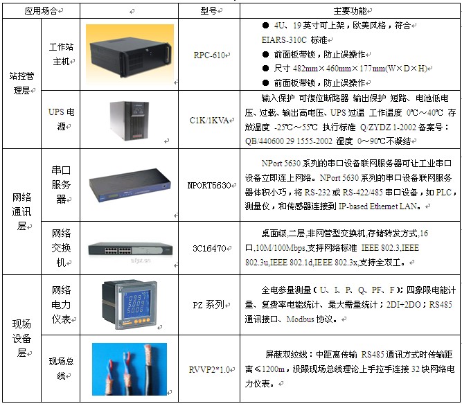 現場設備層設備為133台電力儀表。這些設備分別根據設計要求安裝在相應的配電回路上。通過RS-485接口實現與上位機係統的數據交互。多功能表和漏電儀表的通訊規約為Modbus-RTU,保護裝置的通訊規約為IEC60870-5-103;通訊管理層由2台Nport-5630串口服務器和1台交換機構成,實際工程中使用了8個485串口,剩下8個串口備用。串口服務器將RS-485總線協議轉換為工業以太網協議,通過TCP/IP與站控管理層主機相連,構建數據鏈路。通訊管理層設備均安裝在電氣值班室的值班人員操作台中,與站控管理層設備安裝在一起; 站控管理層設備為華北工控主機、顯示器、HP打印機以及山特UPS電源,均安裝在電氣值班室的操作台中。通過安裝在主機上的Acrel-2000電力監控係統軟件實現對現場儀表數據的采集、處理以及各種人機交互功能,具體設備如下表: