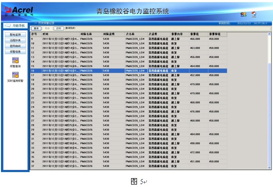 4.4事故報警和追憶:電力監控係統定義了所有配電回路過負荷、低壓回路剩餘電流過大及10kV回路開關量變位實時報警和曆史報警查詢等功能,如圖5所示,列表中列出報警發生和恢複的時間、回路名稱、回路編號、數據點、報警內容和報警值等數據,可見某些回路剩餘電流值超標較嚴重。