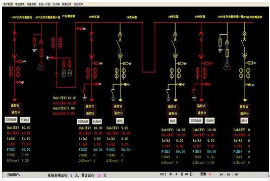 高gao壓ya一yi次ci圖tu為wei係xi統tong主zhu監jian控kong畫hua麵mian,主zhu要yao實shi時shi監jian測ce高gao壓ya回hui路lu的de運yun行xing狀zhuang態tai,重zhong要yao的de電dian參can量liang等deng。界jie麵mian上shang各ge回hui路lu一yi次ci圖tu顯xian示shi紅hong色se代dai表biao合he閘zha,綠lv色se代dai表biao分fen閘zha。