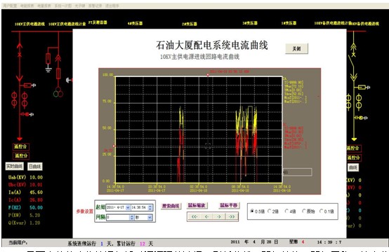 界麵內的的功能按鈕包括時間間隔的選擇,刷新曲線、鼠標縮放、鼠標平移,搜索曲線、曲線在顯示見麵裏的左右移動以及電流曲線位置的調整。電流在趨勢圖中位置的調整分為5個檔,用戶可以根據查詢電流的大小,選擇適當的量程.