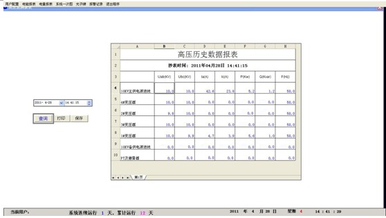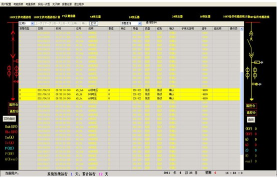 係統提供簡單、易用、良好的用戶使用界麵。采用全中文界麵,配電係統電氣一次主接線圖,顯示設備狀態及實時運行參數;畫麵實時動態刷新;模擬量顯示;開關量顯示;報警記錄顯示等。