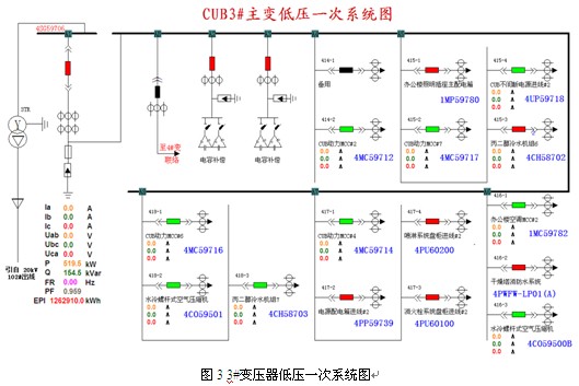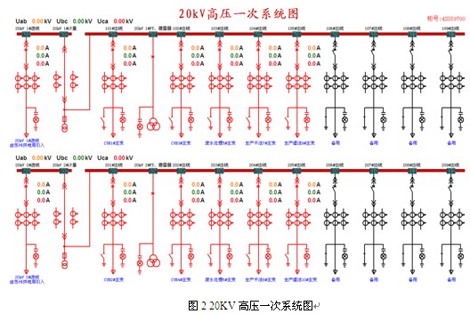 係統具有友好的人機界麵,便於普通的現場值班人員查看並記錄相關信息,係統一次圖(如圖2、圖3)不僅顯示了線路的開關狀態,還實時顯示電壓、電力、有功電度等重要的電力參數。所有數據信息都定期的保存到數據庫中。
