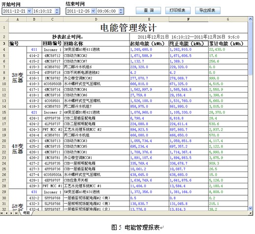 係統采集的有功電度數據,按照回路名稱的不同,自動生成日報表、月報表和年報表並有報表打印功能,並可對某一回路的某一時間段內的用電量進行查詢與打印,同時這些報表也能以Excel的格式導出。如圖5所示。