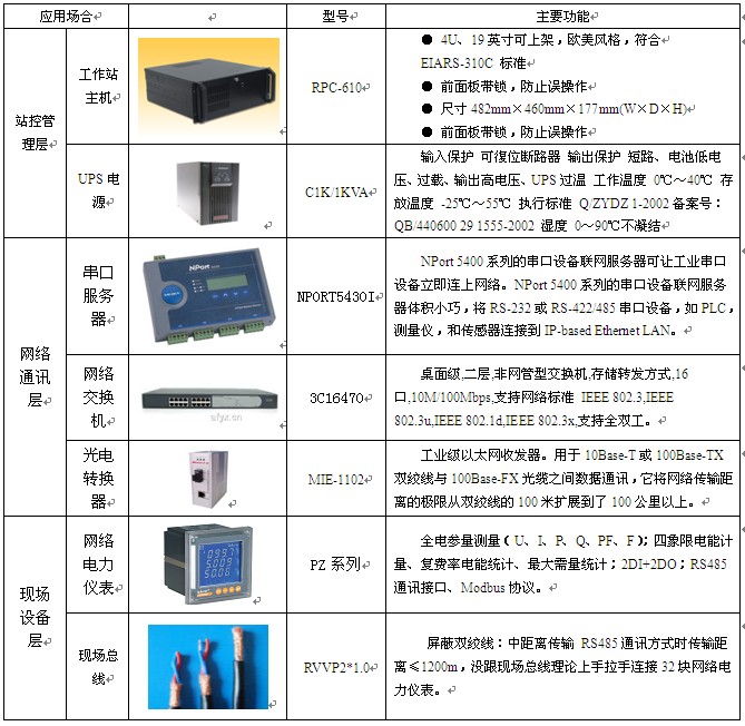 對中化平原化工有限公司提出的需求和我們確定的組網方案,站控管理層設備層采購華北工控的工業主機,聯想的顯示器,SANTAK的UPS以及HP的打印機;網絡通訊層使用MOXA的NPORT5430I串口服務器,華為3C16470網絡交換機;現場設備層采上海安科瑞公司PZ80係列網絡電力儀表,總線鋪設屏蔽雙絞線,以滿足係統組網的要求,具體設備如下表: