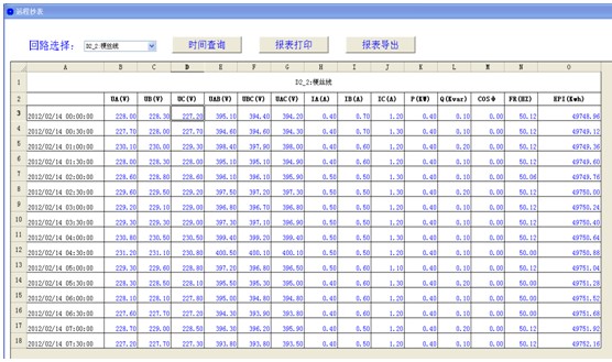4.2. 遠程抄表查詢:各個配電室各個回路按照時間段進行曆史數據查詢。選擇回路後,可選擇時間間隔、時間長度對該回路進行曆史數據精確查詢,包括電壓、電流、功率、功率因數和電能等常用數據。查詢結果可導出成EXCEL表格進行保存,也可打印保存