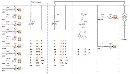 4.1. 一次圖顯示:ACREL-2000軟件通過中間采集設備采集現場電力監控儀表數據,並在係統一次圖顯示出來。如下圖所示,各個回路三相電流、三相電壓、有功功率、無功功率、功率因數、有功電能等電參量實時刷新顯示,能直觀反映該係統各進出線回路運行狀況。