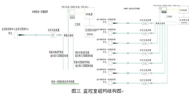 yishangtuweimoushejiyuanzhenduizhongqingguangdashenghuofuwuqudegongshuigongdianxitongshejidenenghaojiancexitongtuopujiegoutu。tuerzhongzuobianweidandongjianzhudegongshuixitongtuopujiegou,youbianweidandongjianzhugongdianxitongtuopujiegou。zhenggexitongbaokuogaijianzhuqundeqigezixitonghezhongxinjiankongshideyigezongjiankongxitong。zixitongdeshujubaokuo:獨棟建築樓層中的配電豎井內的電表數據;樓層各房間內供水豎井內的冷/熱水表數據。數據全部由屏蔽線經RS485接口傳至數據采集器,然後由五類線經RJ45接(jie)口(kou)接(jie)入(ru)當(dang)地(di)局(ju)域(yu)網(wang)。圖(tu)三(san)中(zhong)左(zuo)邊(bian)表(biao)示(shi)獨(du)棟(dong)建(jian)築(zhu)能(neng)耗(hao)監(jian)測(ce)子(zi)係(xi)統(tong)監(jian)控(kong)室(shi)的(de)組(zu)網(wang)結(jie)構(gou)圖(tu)。網(wang)絡(luo)交(jiao)換(huan)機(ji)下(xia)端(duan)連(lian)接(jie)來(lai)自(zi)水(shui)表(biao)和(he)電(dian)表(biao)的(de)多(duo)個(ge)數(shu)據(ju)采(cai)集(ji)器(qi),上(shang)端(duan)連(lian)接(jie)監(jian)控(kong)主(zhu)機(ji)完(wan)成(cheng)數(shu)據(ju)上(shang)傳(chuan)。七(qi)個(ge)子(zi)係(xi)統(tong)的(de)數(shu)據(ju)采(cai)用(yong)光(guang)纖(xian)通(tong)訊(xun)的(de)方(fang)式(shi)轉(zhuan)發(fa)至(zhi)中(zhong)心(xin)監(jian)控(kong)室(shi),如(ru)圖(tu)三(san)中(zhong)右(you)邊(bian)圖(tu)示(shi)。每(mei)個(ge)監(jian)控(kong)主(zhu)機(ji)配(pei)UPS電源。