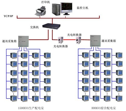 為滿足兩個配電室統一監控的要求,容量1500KVA的生產配電室和800KVA的(de)宿(xiu)舍(she)配(pei)電(dian)室(shi)通(tong)過(guo)一(yi)根(gen)單(dan)模(mo)四(si)芯(xin)的(de)光(guang)纖(xian)相(xiang)連(lian),經(jing)光(guang)電(dian)轉(zhuan)換(huan)後(hou)接(jie)入(ru)網(wang)絡(luo)交(jiao)換(huan)機(ji),進(jin)而(er)實(shi)現(xian)對(dui)現(xian)場(chang)數(shu)據(ju)的(de)采(cai)集(ji),存(cun)儲(chu),處(chu)理(li),實(shi)時(shi)顯(xian)示(shi)以(yi)及(ji)曆(li)史(shi)查(zha)詢(xun)