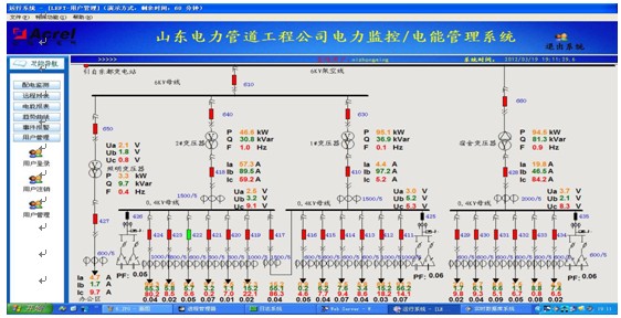 山東電力管道工程公司有兩個配電室:容量1500KVA的生產配電室和800KVA的宿舍配電室,兩個配電室距離約1500米mi,為wei實shi現xian配pei電dian係xi統tong的de規gui範fan化hua管guan理li,對dui舊jiu的de配pei電dian係xi統tong進jin行xing改gai造zao,兩liang配pei電dian室shi內nei的de老lao式shi指zhi針zhen式shi儀yi表biao更geng換huan為wei上shang海hai安an科ke瑞rui公gong司si的de網wang絡luo電dian力li儀yi表biao,配pei套taoAcrel-2000電力監控軟件對現場進行監控,監控室位於生產配電室內。